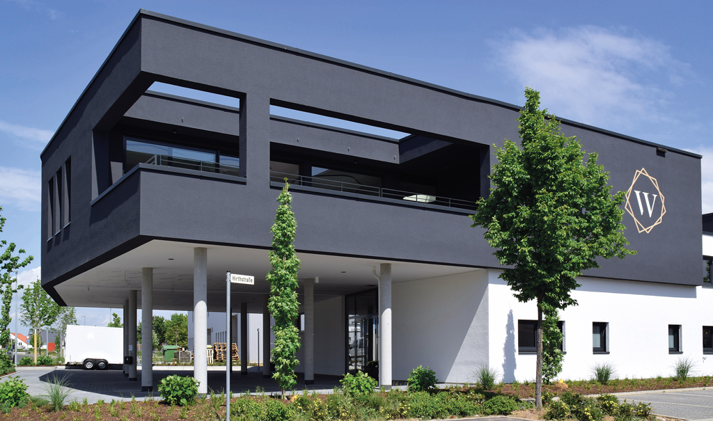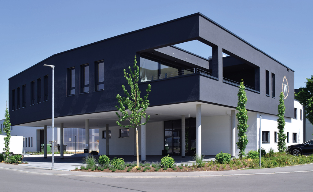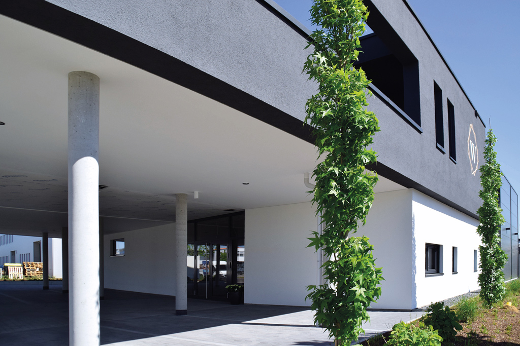 Realisiert wurde eine eingeschossige Lagerhalle mit den Abmessungen von ca. 22,5m x 10,5m sowie eine lichte Höhe von ca. 6,5m. Der zweigeschossige Verwaltungstrakt schließt umittelbar südwestlich an die Lagerhalle an, wobei das Obergeschoss Richtung Südwesten noch ca. 10m über das Erdgeschoss hinaus auskragt. Unter dem auskragenden Obergeschoss sind Stellplätze.
